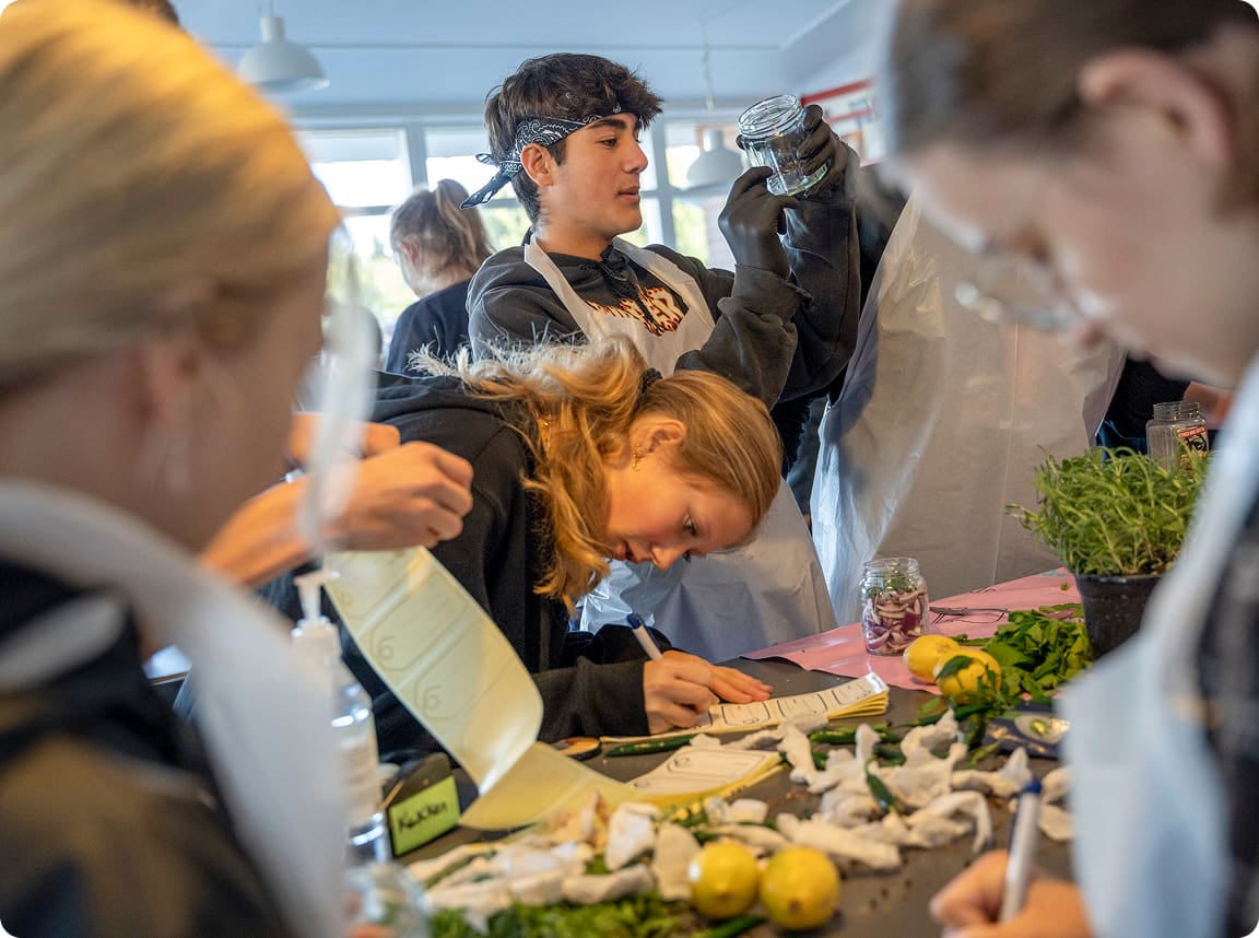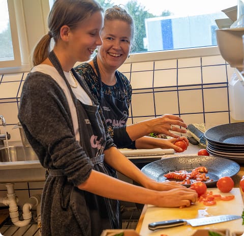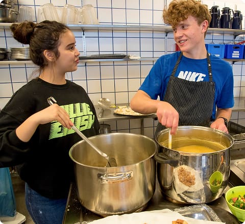 Vi laver maden helt fra bunden af, og eleverne er selv med til at sammensætte menuerne. Vi udfordrer vores smagsløg og bliver dygtigere indenfor hele madlavningskunsten.